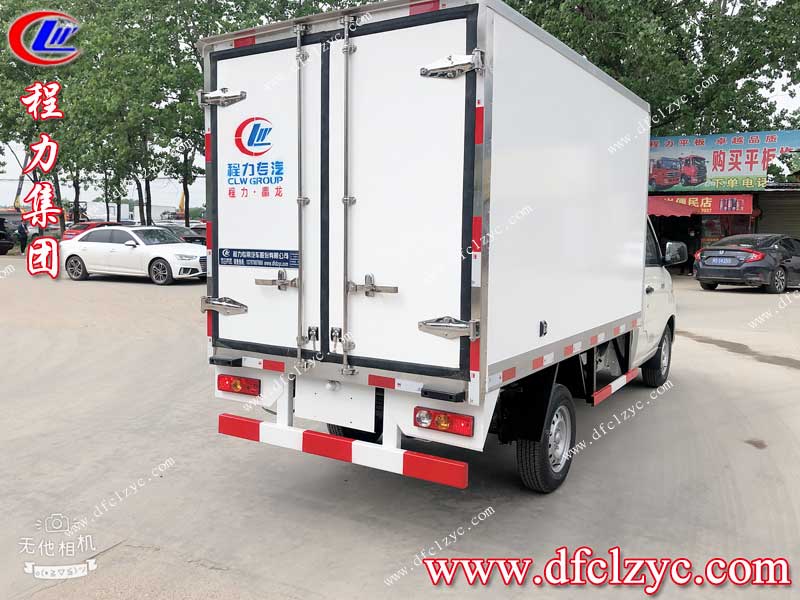 2019-12-24程力集團國六長安冷藏車上裝采用內(nèi)外玻璃鋼,中間保溫層,廂體厚度8cm,底板鋁花紋板,門鎖鉸鏈不銹鋼,