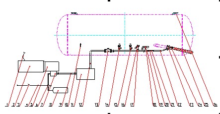 1.離合器踏板 2.發(fā)動(dòng)機(jī) 3.電開(kāi)關(guān) 4.電線(xiàn) 5.變速箱 6.電磁氣閥 7.取力器 8.儲(chǔ)氣筒 9.傳動(dòng)軸 10. 壓力表 11. 空壓機(jī) 12. 進(jìn)氣管 13. 21 止回閥 14、15、18、20.球閥 16.安全閥(0-0.3Mpa) 17.中小異徑三通 19.異徑外接頭 22. 蒸汽膠管23.蝶閥 24.二次吹氣總成 25.出料軟管 26. 卸壓管路