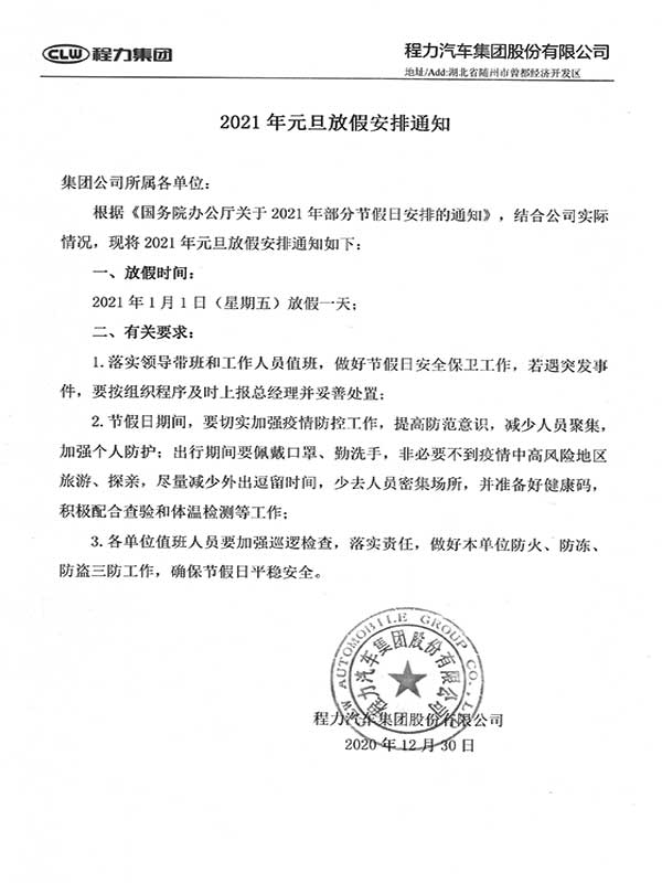 下面是湖北程力集團(tuán)2021年元旦放假安排通知!